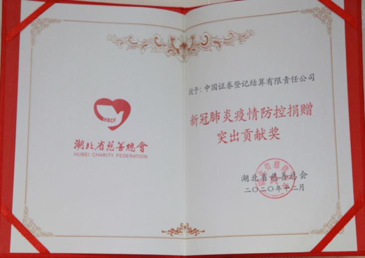 2020年2月,中國結算向湖北省慈善總會捐贈人民幣3000萬元用于支援湖北省新型肺炎疫情防控工作,其中1000萬元定向支援黃岡市三家定點醫院(黃岡市中心醫院400萬元、黃岡市中醫醫院300萬元、黃州區人民醫院300萬元)。