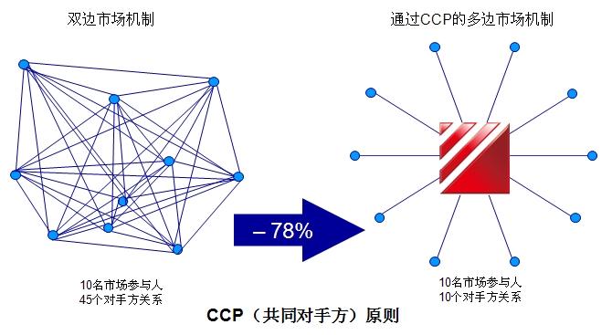 (二)CCP(共同對手方)原則。在結算過程中,中國結算介入證券交易中成為所有買方和賣方的交收對手,并保證交收順利完成。CCP原則有助于簡化結算過程,提高效率。同時,中國結算根據結算業務規則集中管理市場中的對手方信用風險,有利于控制和降低市場整體風險水平。以下圖為例:市場有10名參與人,他們相互之間有45個對手方關系;如果由中國結算充當共同對手方,則只需要10個對手方關系,對手方關系減少78%。